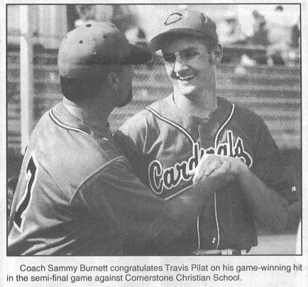 Coach Sammy Burnett congratulates Travis Pilat on his game-winning hit in the semi-final game against Cornerstone Christian School.