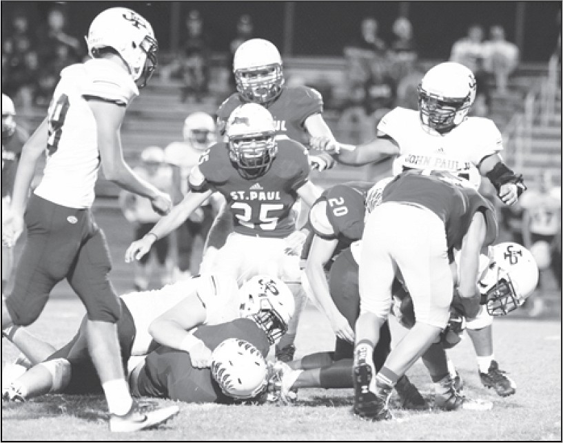 The defenses took over as St. Paul got a turnover on the next series on the fumble recovery by Alex Hull but could not move the ball against the John Paul II defense.