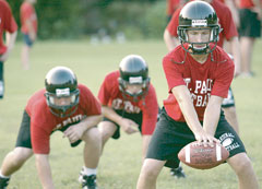 St. Paul will shift to the wing-T with Justin Matias, front, at quarterback and Eric Patek, left, and John Paul Patek at running back.