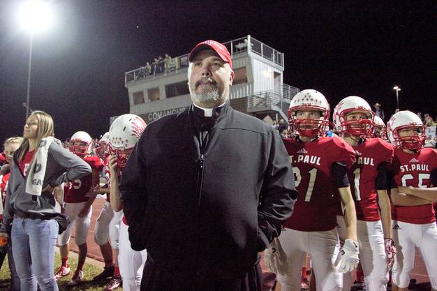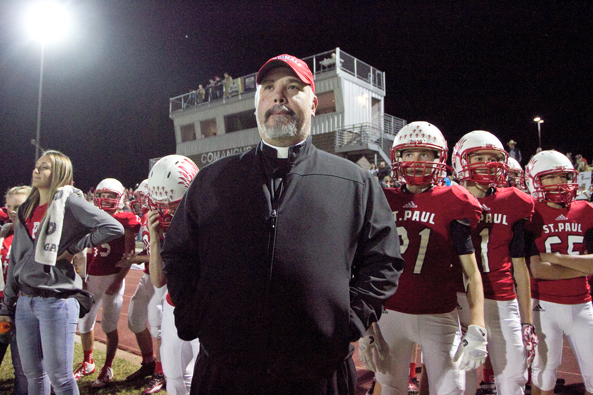Every Friday, he gives a special blessing at the Catholic school's lunchroom for all the sports teams and leads the prayer in the football locker room before they take the field.